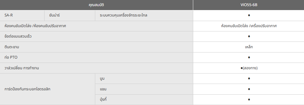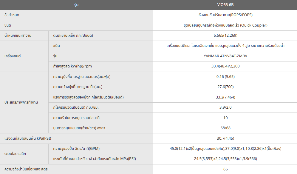 รถขุดยันม่าร์ ViO55-6B ขนาด 5.5 ตัน ให้ทุกงานขุดเป็นเรื่องง่าย มั่นใจได้ทุกสถานการณ์ตอบโจทย์ทั้งงานก่อสร้างและงานเกษตรกรรมเอนกประสงค์ ทำงานได้หลากหลาย ทั้งงานขุด งานเจาะทำลาย งานวางระบบชลประทาน งานวางฐานราก สะดวกสบาย ด้วยห้องคนขับปรับอากาศทำงานได้ยาวนานไม่เมื่อยล้า เครื่องยนต์ดีเซลยันม่าร์ 4TNV-Turbo Direct Injection แรงจัด ประหยัดน้ำมัน